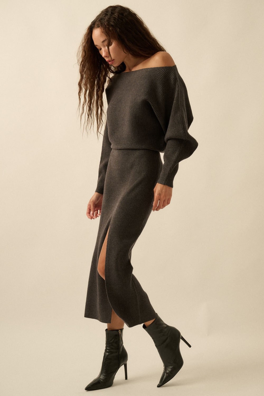 The Nevaeh Charcoal One Shoulder Sweater Midi Dress