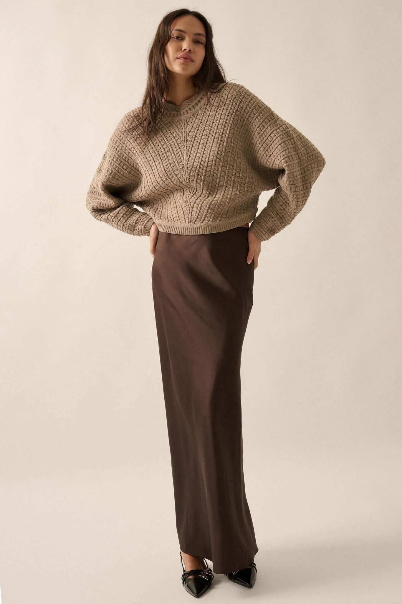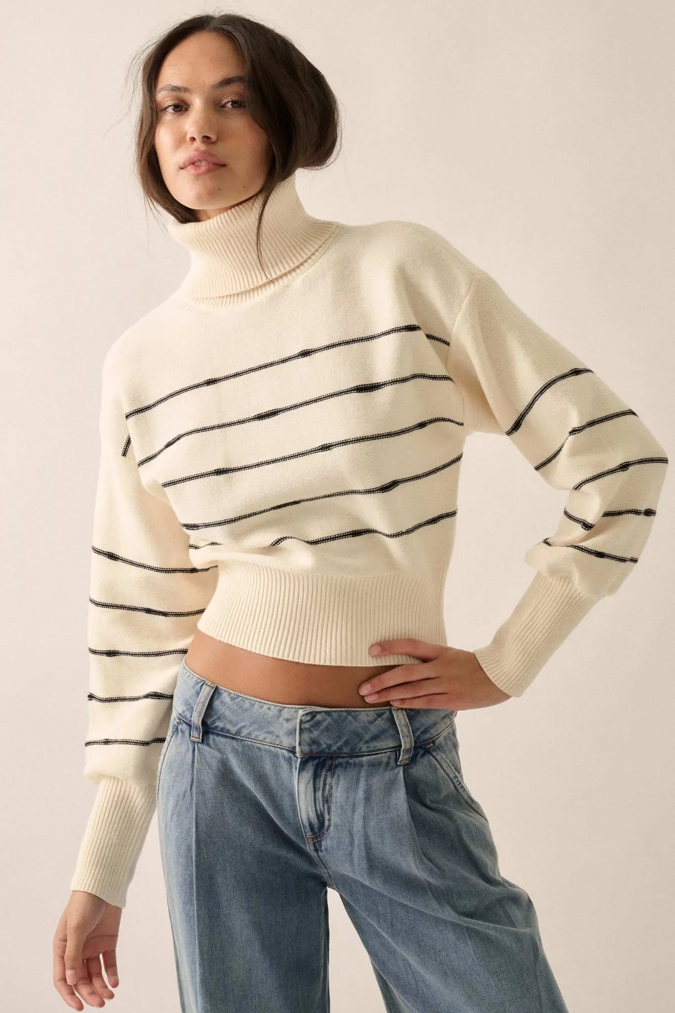 Balance the wider lower body by adding volume and interest to the upper body.