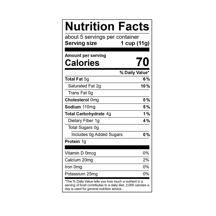 Non-GMO Popcorn, Sunflower Oil, Parmesan Cheese Powder (Parmesan Cheese [Partially Skim Milk, Cultures, Salt, Enzymes], Disodium Phosphate), White Cheddar Cheese Powder (Cheddar Cheese [Milk, Cultures, Salt & Enzymes], Disodium Phosphate, Silicon Dioxide added as a Flow Agent at less than 2%), RBD Coconut Oil, Black Pepper, Celtic Sea Salt.