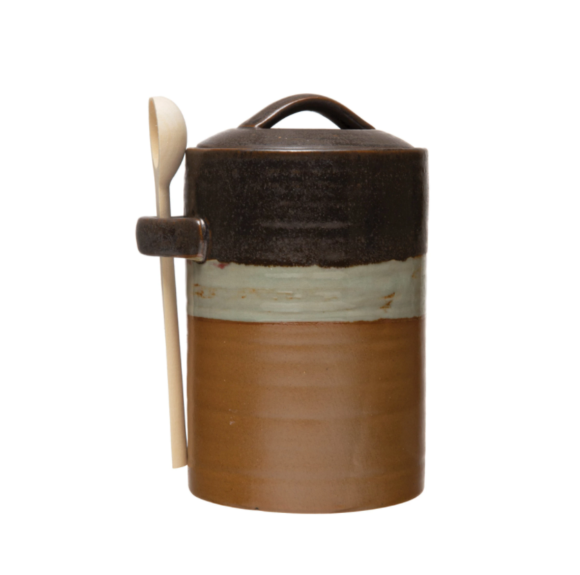 This canister is perfect for storing small foods or items in style. Made out of stoneware, this canister comes with a wooden spoon, and has a multi-colored palette. With a reactive glaze finish, this unique canister instantly adds style to any space needing a little extra storage.
