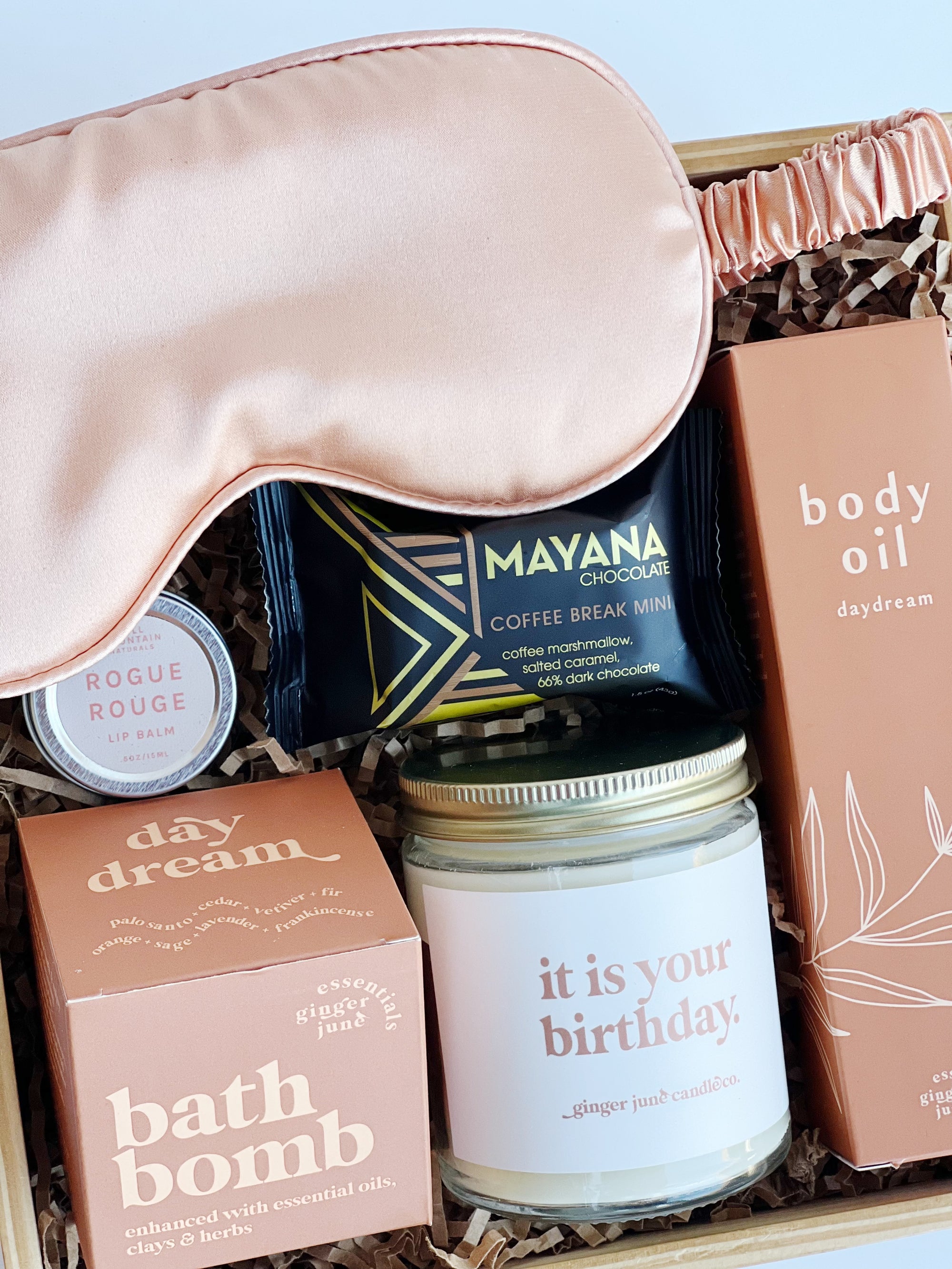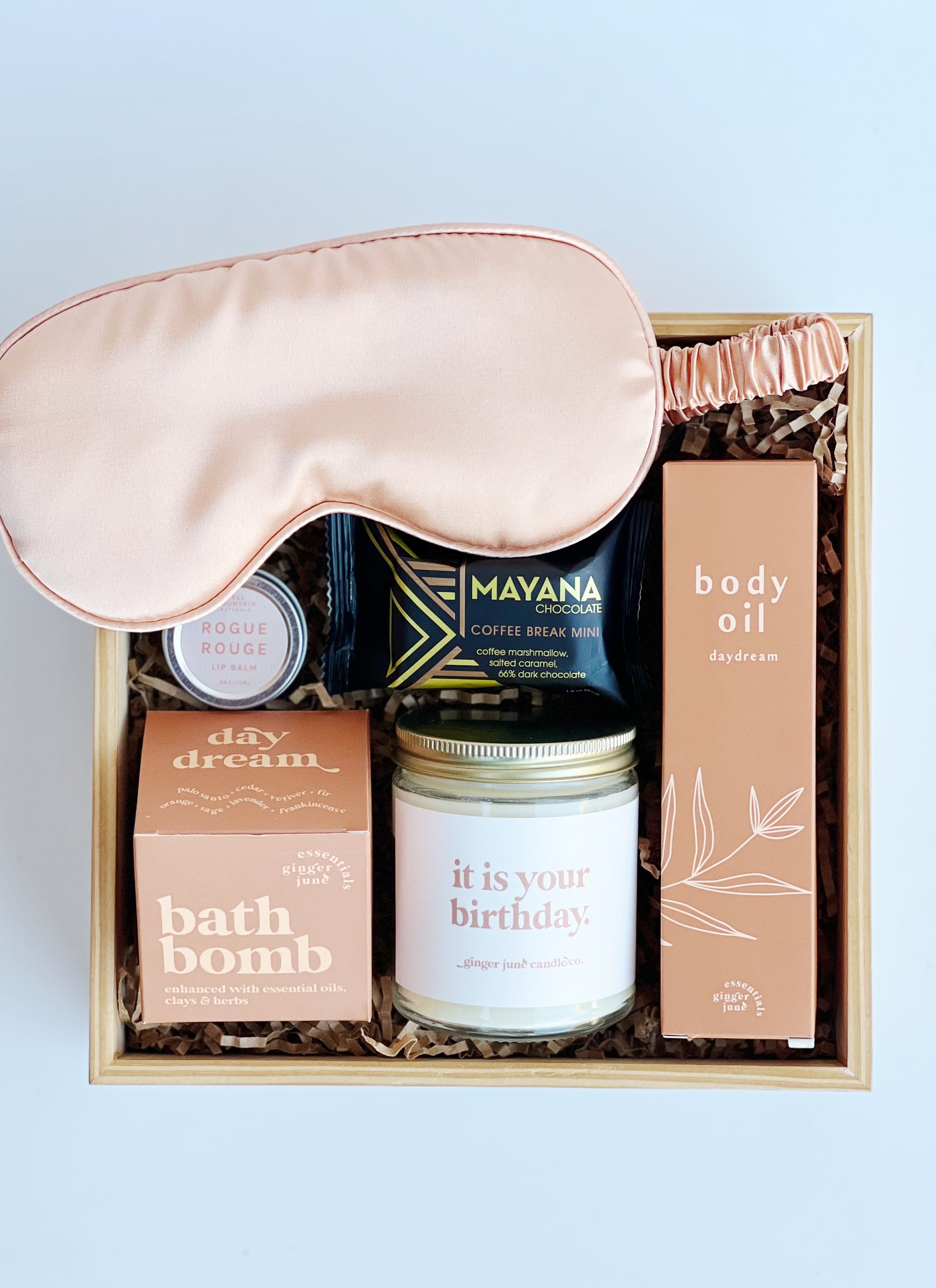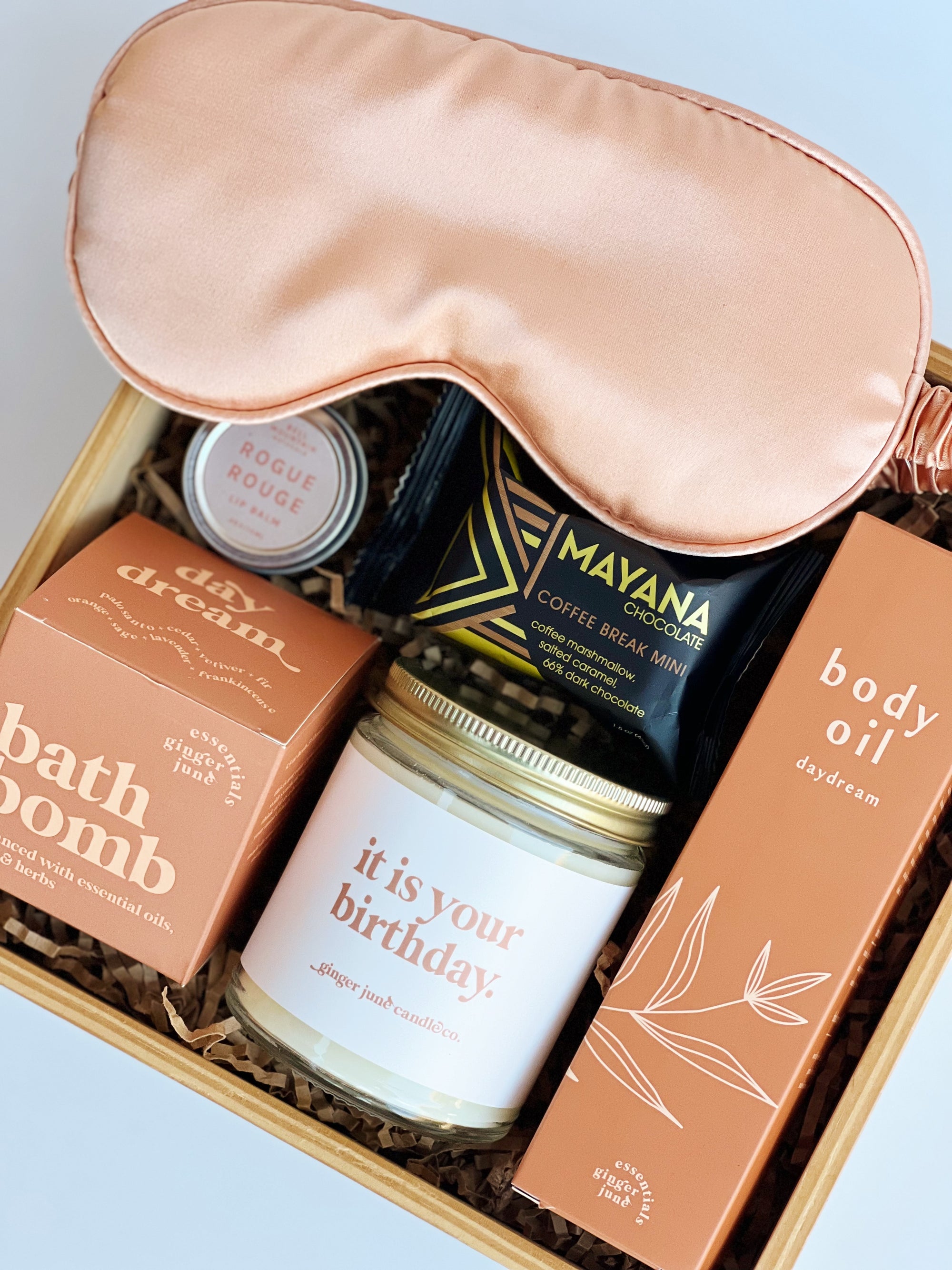 Step right up and unwrap some birthday magic with our 'Relax, It's Your Birthday' gift box! Slide on that luxurious satin sleep mask and drift away to dreamland. Give your lips a hint of glam with our lovely lip tint. Now, imagine savoring that coffee-infused chocolate treat (yum!) and then sinking into a bath fizzling with our special bath bomb. Add a few drops of the body oil for that extra silky feeling. And for the grand finale, light up the candle and make a wish. It's your day – let's make it dazzlingly relaxing!