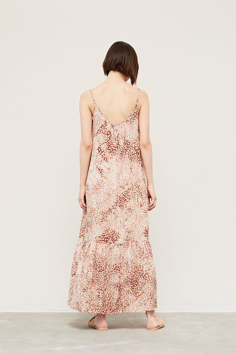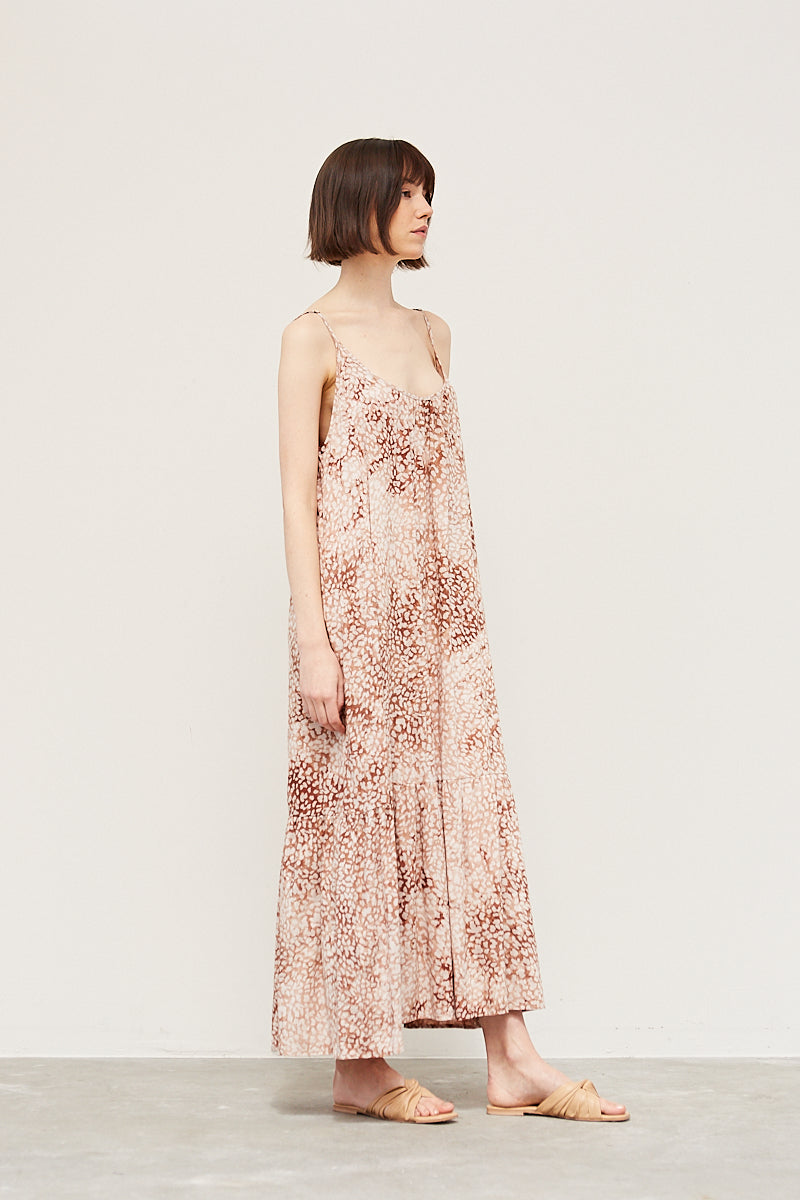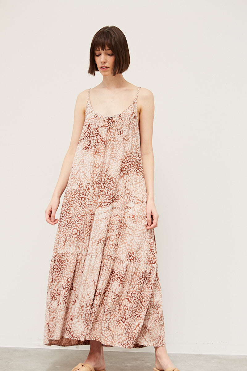 A painterly leopard design gives this maxi dress an added layer of femininity, with a scoop neck, tiered skirt and flowy fabric it is a go-to dress for the season.